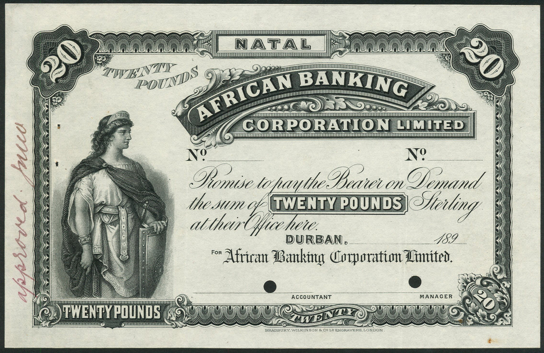 (†) African Banking Corporation Limited, Natal, proof £20, Durban, 189-, no serial number, uniface, black and white, allegorical maiden (Africa) at left, NATAL in top margin