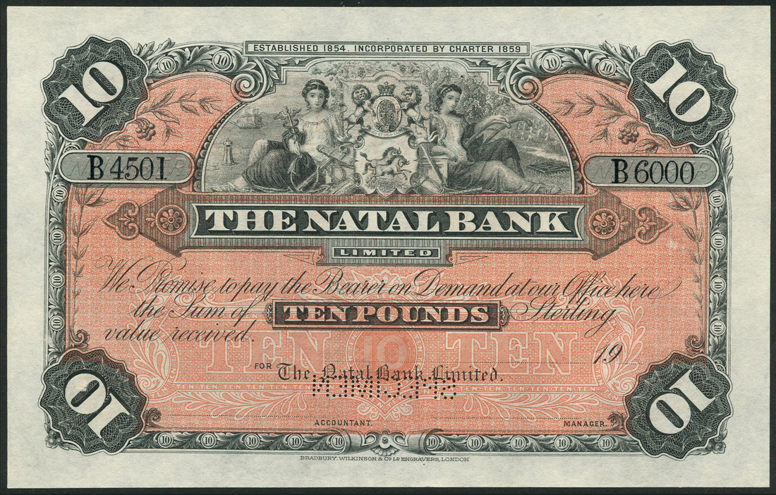 Natal Bank Limited, printers archival specimen £10, ND (19--), serial number run B4501-B6000, black on red underprint, coat of arms flanked by allegorical maidens at top centre, reverse red, perforated SPECIMEN