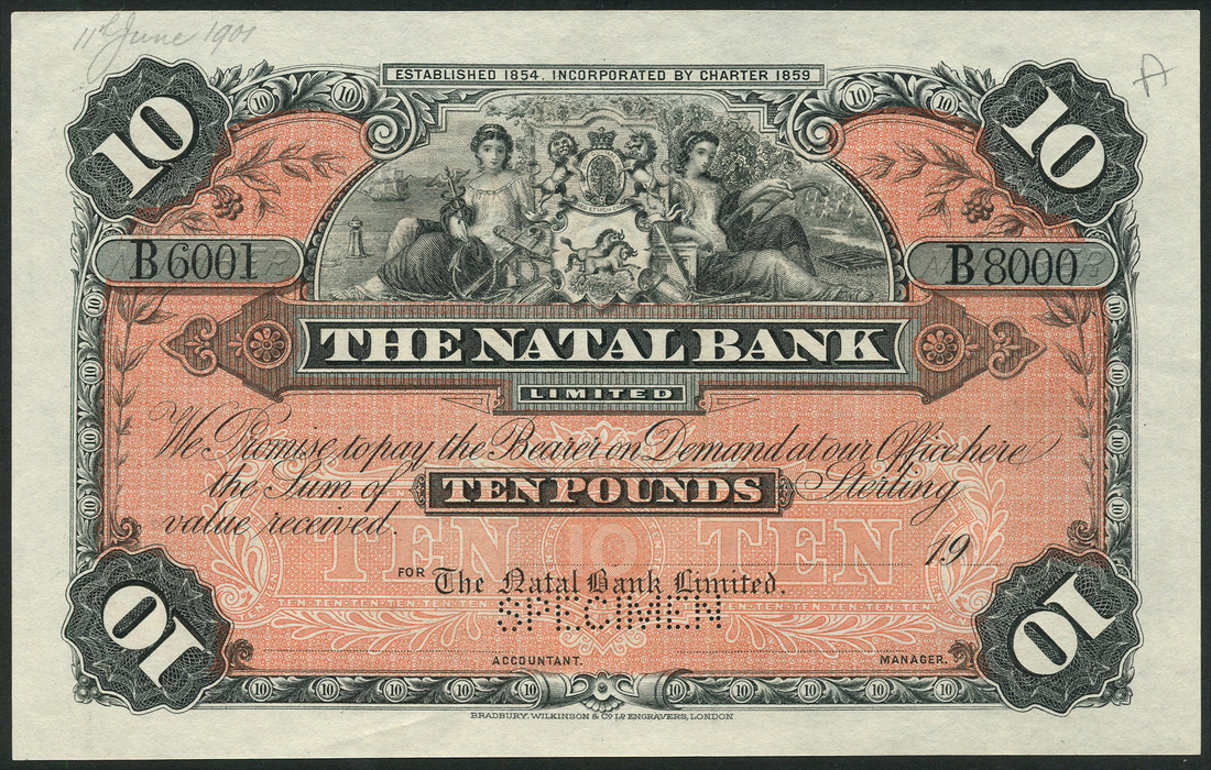 (†) The Natal Bank, colour trial specimen £10, ND (1906), serial range B6001 - B8000, dark grey on salmon pink underprint, arms top centre flanked by allegorical maidens, bank title in black panel at centre, value in corner and at centre, reverse, bank title and value within ornate red panel