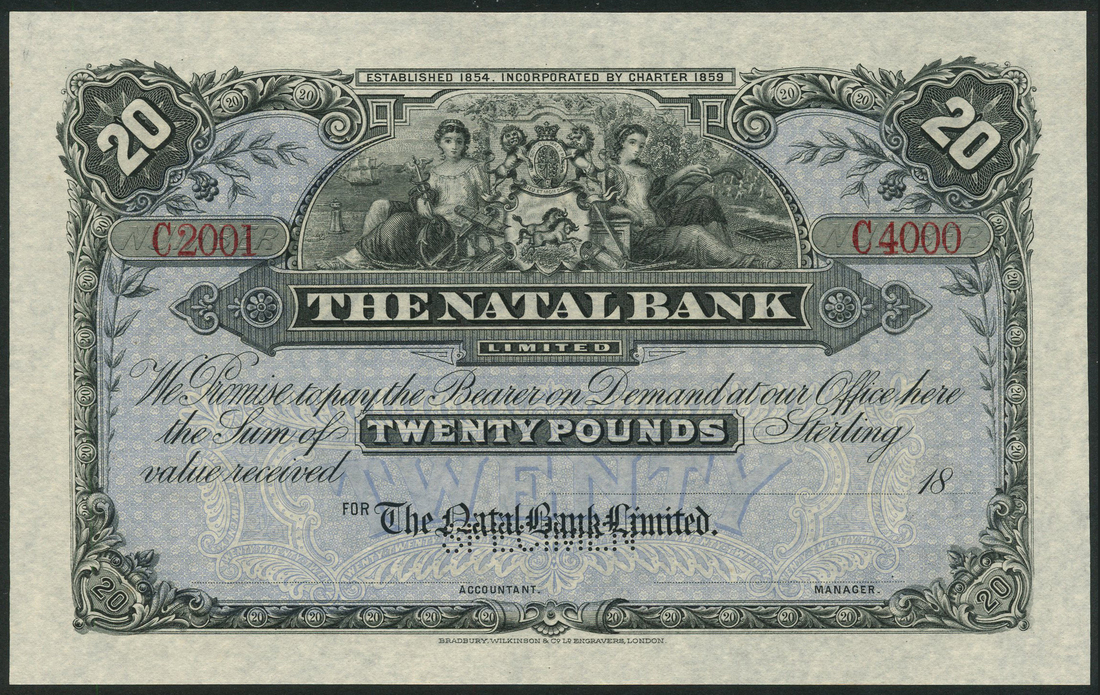 Natal Bank Limited, printers archival specimen £20, ND (18--), serial number run C2001-C4000, black on blue underprint, coat of arms and allegorical maidens at top centre surrounded by ornamental leaves and value, reverse blue, perforated SPECIMEN