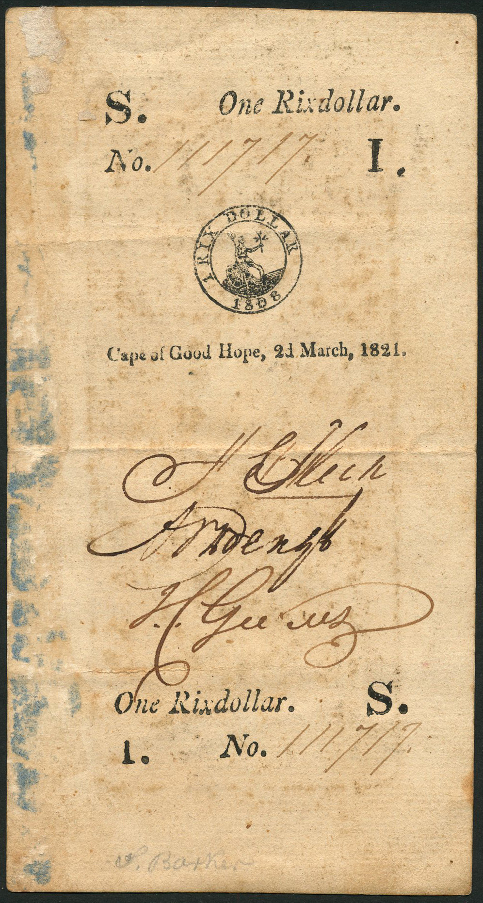 British East India Company, South Africa, 1 rix dollar, Cape of Good Hope, 2 March 1821, serial number 111717, vertical format, black and white, seated Britannia with date 1808 at top centre, reverse black, large and heavy ornate design at centre, signatures of J.C. Fleck, Member, Court of Justice, A.V. Bergh, Director / member of the Lombard Bank and J.C. Gie, Bookkeeper Discount Bank