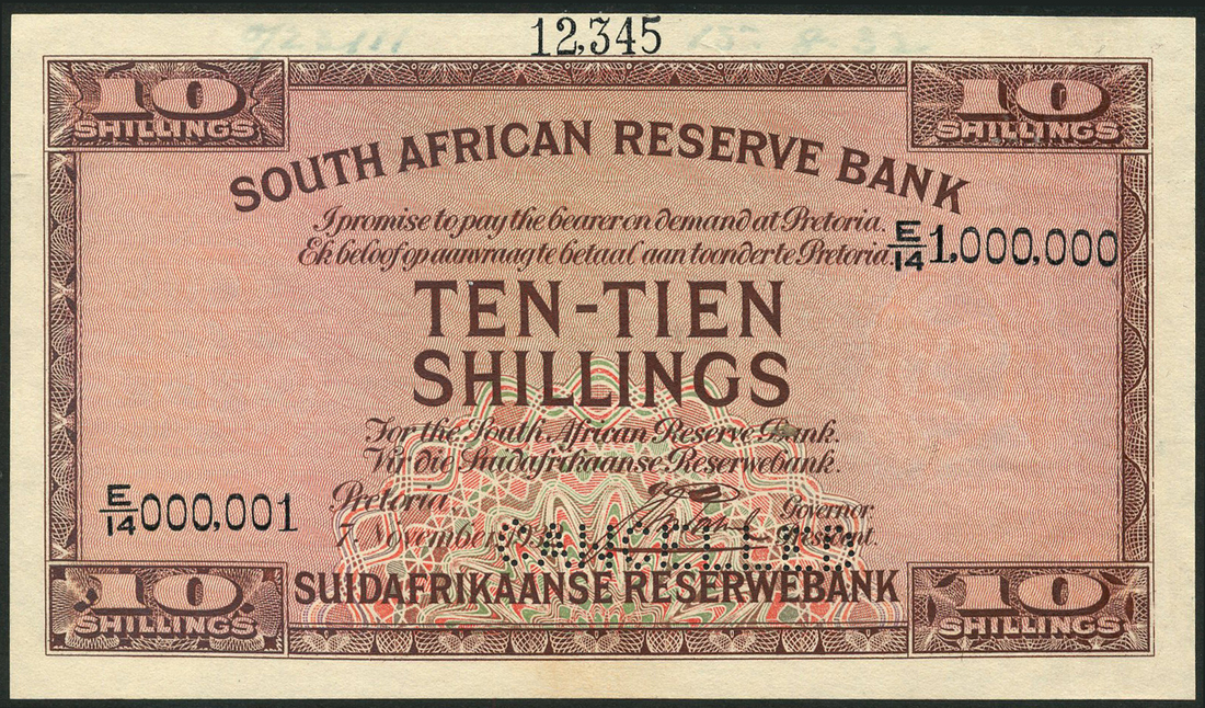 (†) South African Reserve Bank, a selection of specimen 10 shillings (7), 1932,1933,1934,1935,1936,1937,1938, all are pink-brown, value at centre and at each corner, all Postumus signature, reverse pink-brown, arms at centre