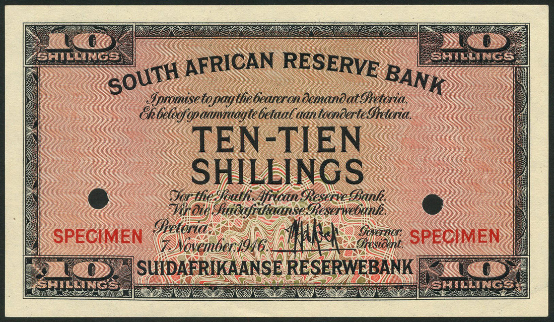 (†) South African Reserve Bank, specimen 10 shillings, 7 November 1946, black, pink and green, value at centre and at each corner, de Kock signature