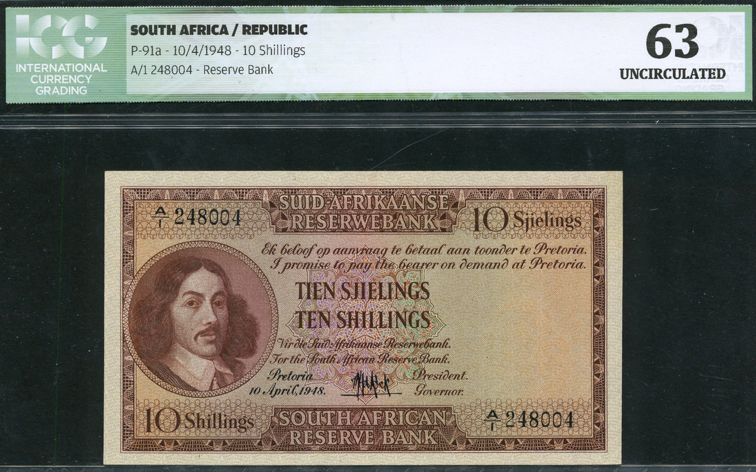 South African Reserve Bank, 10 shillings, 10 April 1948, serial number A/1 248004, brown on multicolour underprint, portrait Jan van Riebeeck in circular frame at left, value low left, top right and at centre, reverse, lion at centre flanked by bank title in English at left and Afrikaans at right