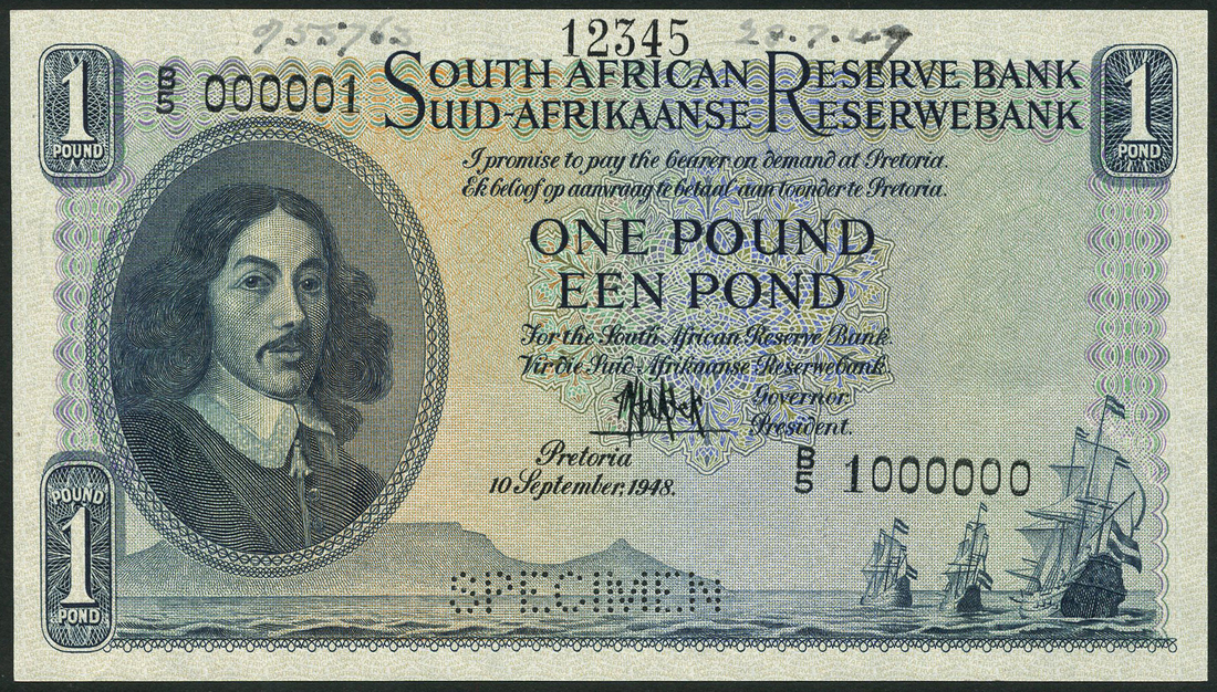 (†) South African Reserve Bank, a selection of specimen £1 (11), 1948, 1950, 1951, 1952, 1953, 1954, 1955, 1956, 1957, 1958, 1959, blue and pale orange and lilac, Van Riebeeck portrait at left, galleons low right, all de Kock signature, first line of text in English, reverse blue-green, arms at centre