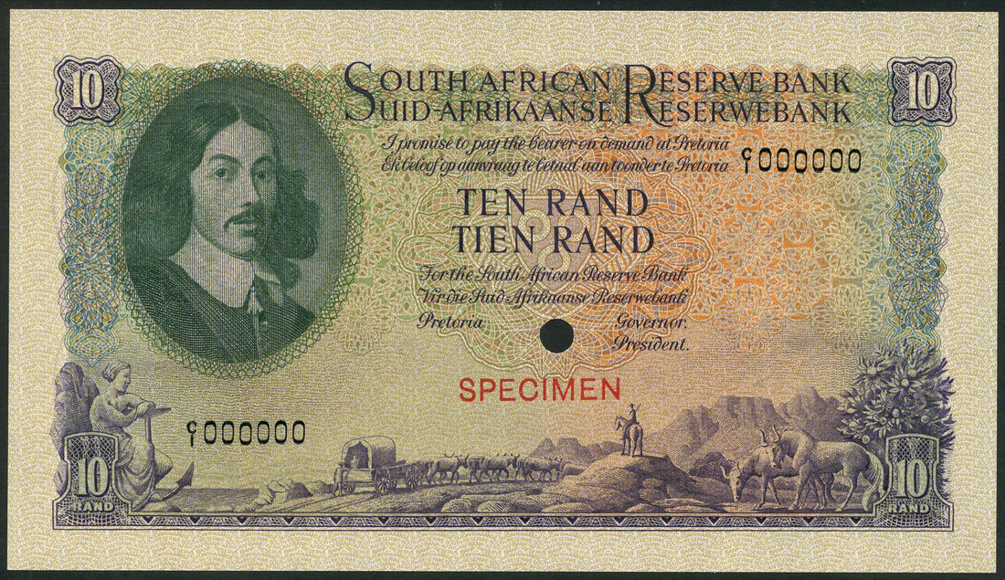 (†) South African Reserve Bank, colour trial 10 Rand, ND (ca 1961), serial number C/1 000000, purple and dark green on multicoloured underprint, portrait of Van Riebeeck at upper left, the Great Trek at lower right, first line of text in English, reverse galleon