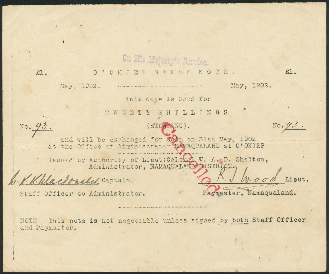 O'Okiep siege notes, Namaqualand Province, 20 shillings/£1, May 1902, manuscript serial number 93, typed black text on pale tan paper, 'Good for TWENTY SHILLINGS (STERLING)' at centre, manuscript signature of Captain W.K.Macdonald, Staff Officer to the Administrator at left, manuscript signature of Lieutenant A.J.Wood, Paymaster, Namaqualand, at right, purple handstamp 'On His Majesty's Service top centre, red 'Cancelled' handstamp at centre