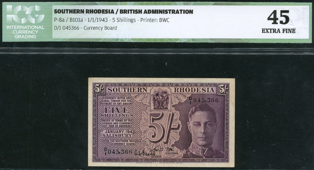 Southern Rhodesia Currency Board, 5 shillings, 1 January 1943, serial number D/1 045366, purple, George VI at right, arms top centre, value at centre and top left and right, Beadle and Fox signatures, reverse purple and lilac, value at centre