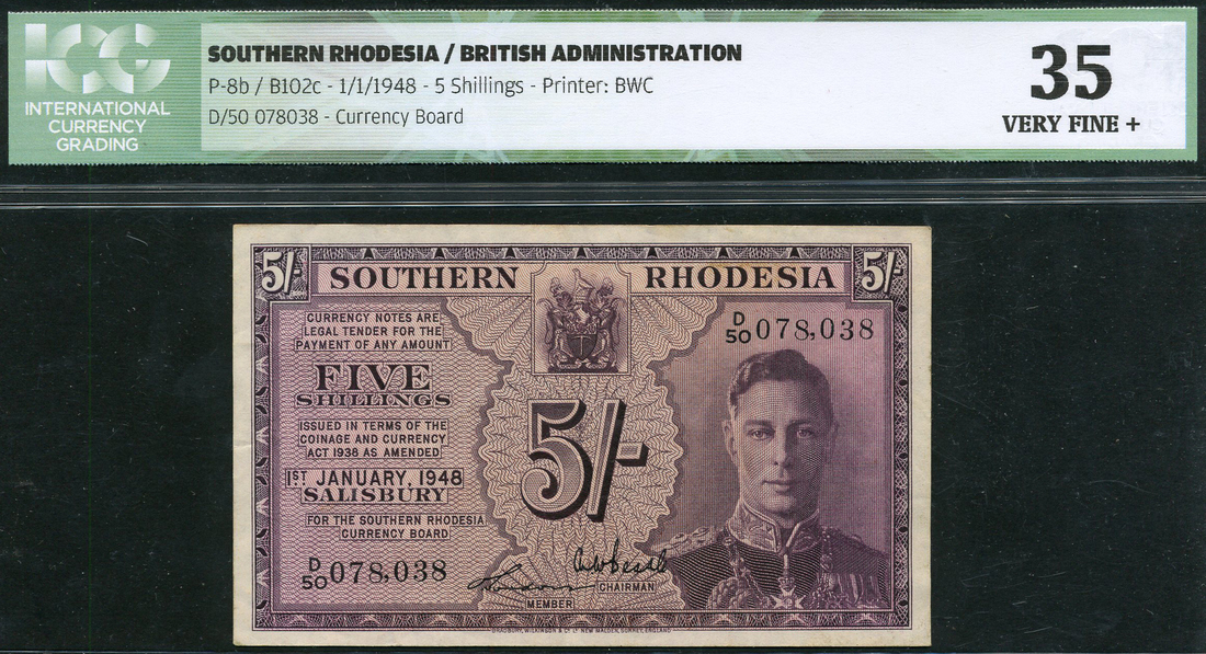 Southern Rhodesia Currency Board, 5 shillings, 1 January 1948, serial number D/50 078038, purple, George VI at right, arms top centre, value at centre and top left and right, Beadle and Gordon signatures, reverse purple and lilac, value at centre