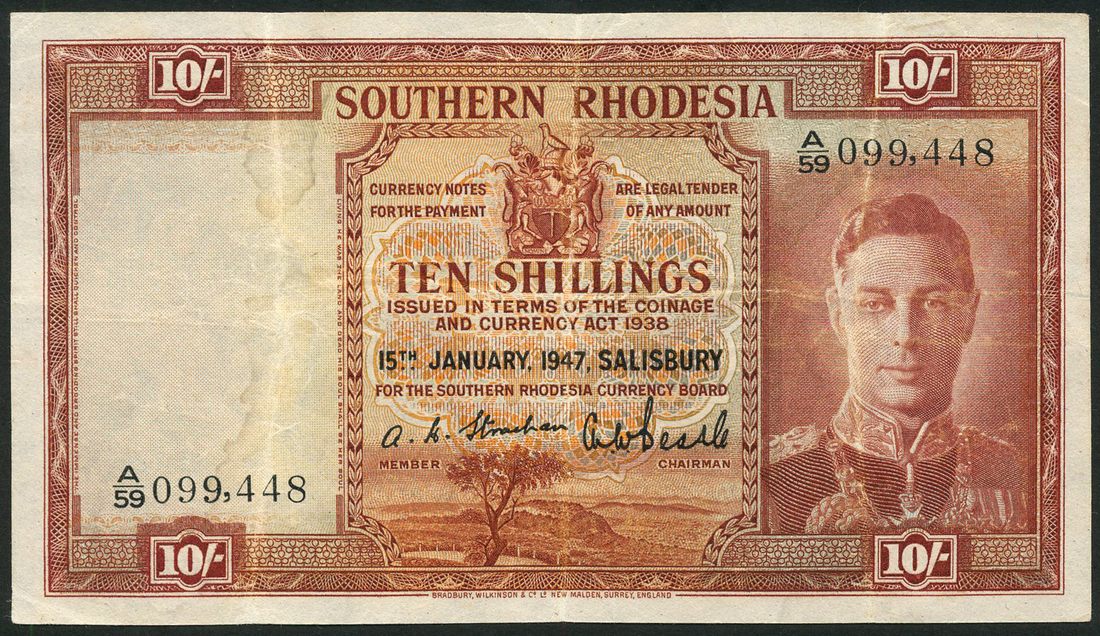 Southern Rhodesia Currency Board, 10 shillings, 15 January 1947, prefix A/59, red-brown, George VI at right, Stachan and Beadle signatures, also £1, 10 March 1954, prefix B/257, green, Elizabeth II at right, Fleming and Grafftey-Smith signatures