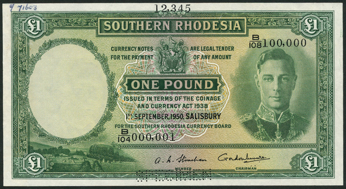 (†) Southern Rhodesia Currency Board, printer's archival specimen £1 (3), all 1 September 1950, serial number runs B/104 000,001 to B/108 100,000, signatures Strachan and Munro; B/109 000,001 to B/113 100,000, signatures Footman and Munro; B114 000,001 to B/118 100,000, signatures Cochran and Munro, green, portrait of King George VI at right, reverse Zimbabwe ruins, all perforated SPECIMEN