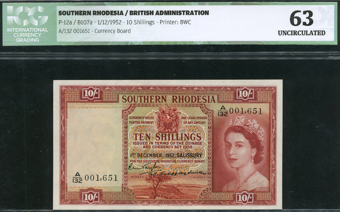 Southern Rhodesia Currency Board, 10 shillings, 1 December 1952, serial number A/132 001651, red-brown and green and orange, Elizabeth II at right, arms top centre, value at centre and top left and right, Taylor and Grafftey-Smith signatures, reverse red-brown and pale green and orange, Victoria Falls at centre, antelope head at left