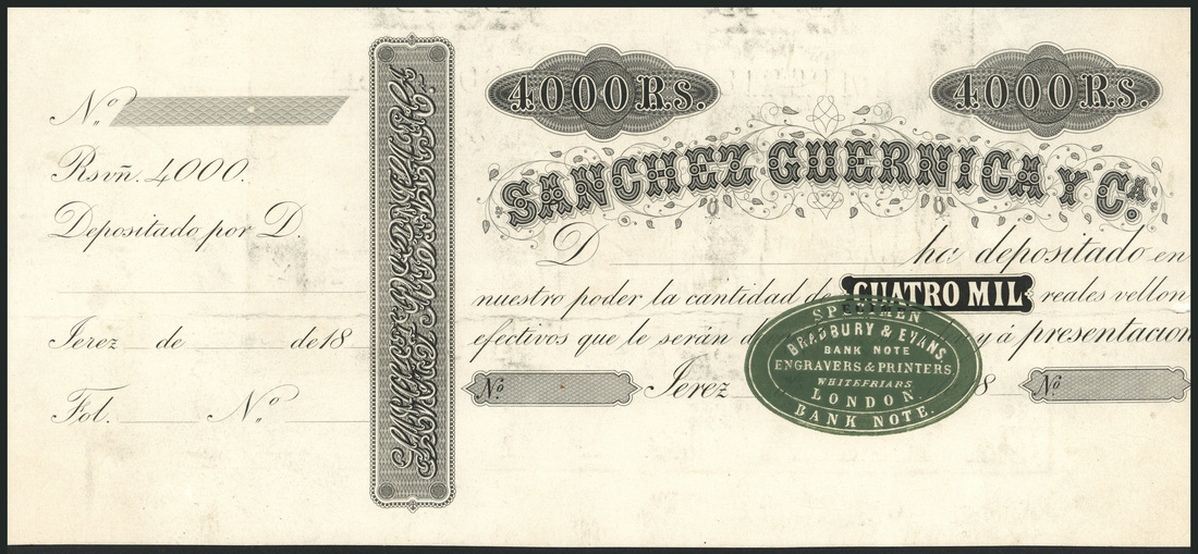 (†) Sanchez Guernica y Ca., Spain, proof 4000 reales on card, Jerez, 18- black and white, value top left and right, counterfoil at left
