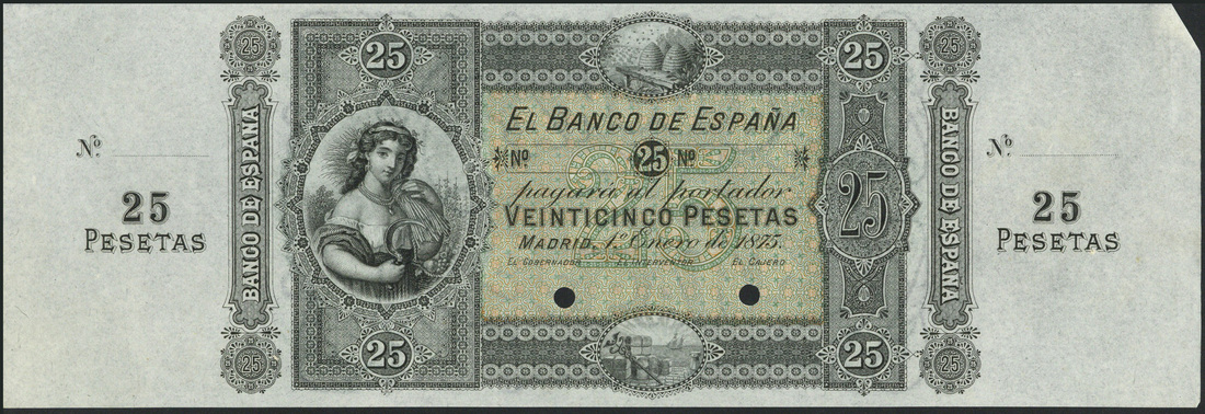 (†) El Banco de Espana, specimen 25 pesetas, 1 January 1875, no serial numbers, black, and white with value in a green and pink central panel. ceres at left, beehives top centre (Industry) and bales and caduceus on quayside low centre (Commerce), counterfoil at left