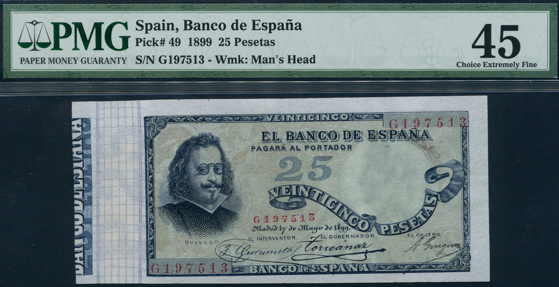 El Banco de Espana, 25 pesetas, 17 May 1899, serial number G197513, blue on light green underprint, portrait Francisco de Quevedo at left, value in ribbon at centre, reverse, brown, medallion at centre, depiction of Hermes at right
