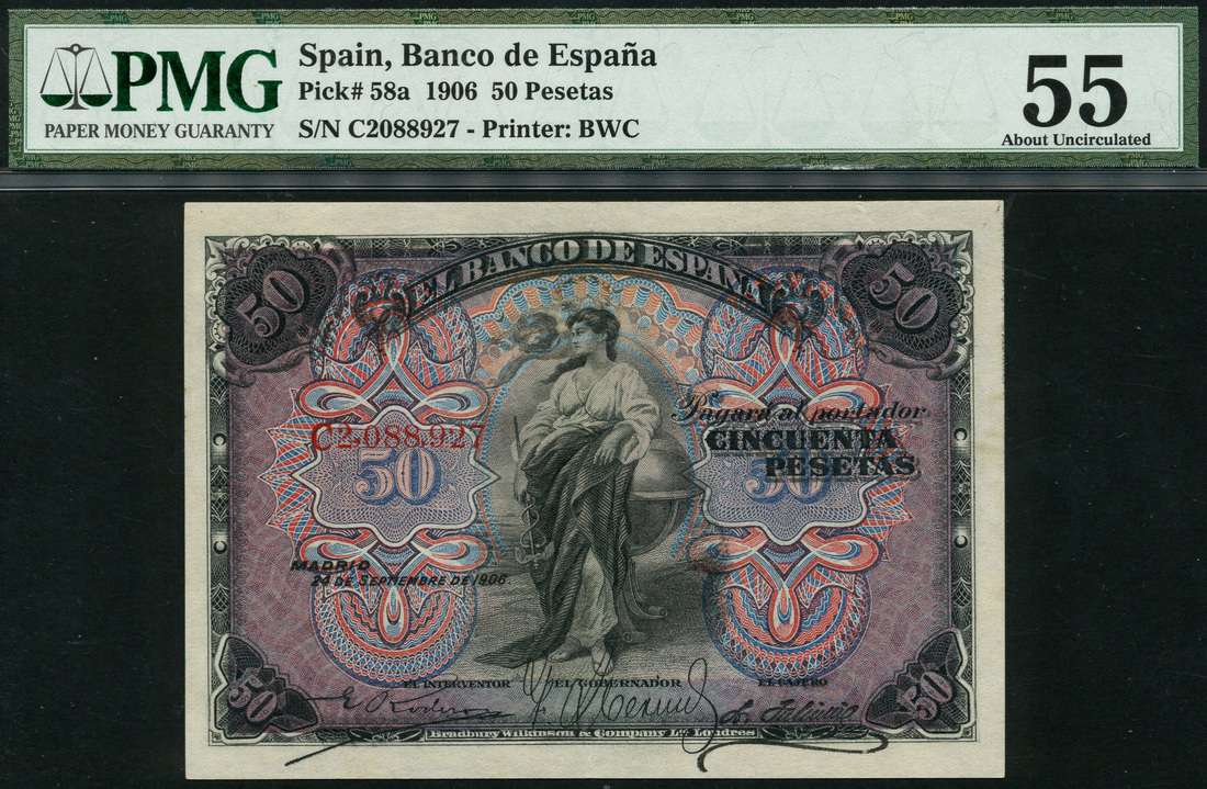 El Banco de Espana, 50 pesetas, 24 September 1906, serial number C2,088,927, black on multicolour underprint, allegorical woman at centre flanked by value in ornate guilloche patterns, reverse, green, arms at centre within elaborate panel