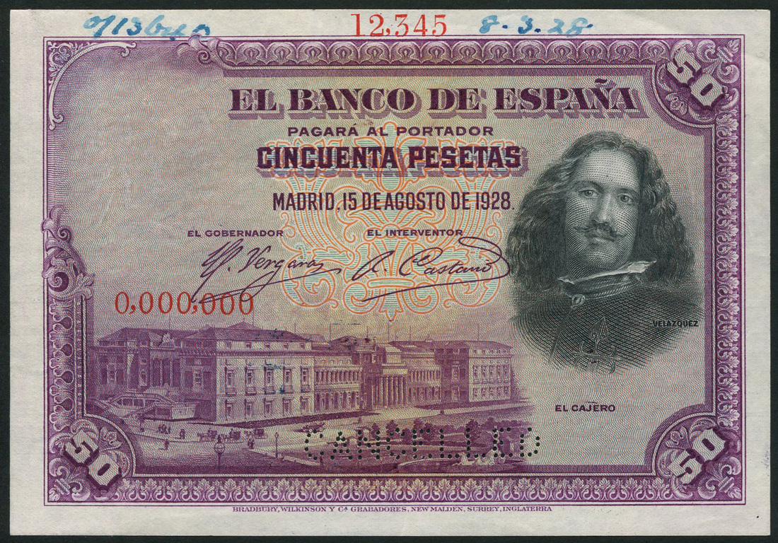 (†) El Banco de Espana, printer's archival specimen 50 Pesetas (2), 15 August 1928, serial number run 0,000,001 to 10,000,000 on reverse; serial number run D0,000,001 to D10,000,000 on reverse, Republic Issue, both black, purple and multicoloured, portrait of Diego Velazquez at right, Prado Museum at lower left, reverse deep blue-green, "La Rendicion de Breda" by Velazquez, perforated CANCELLED