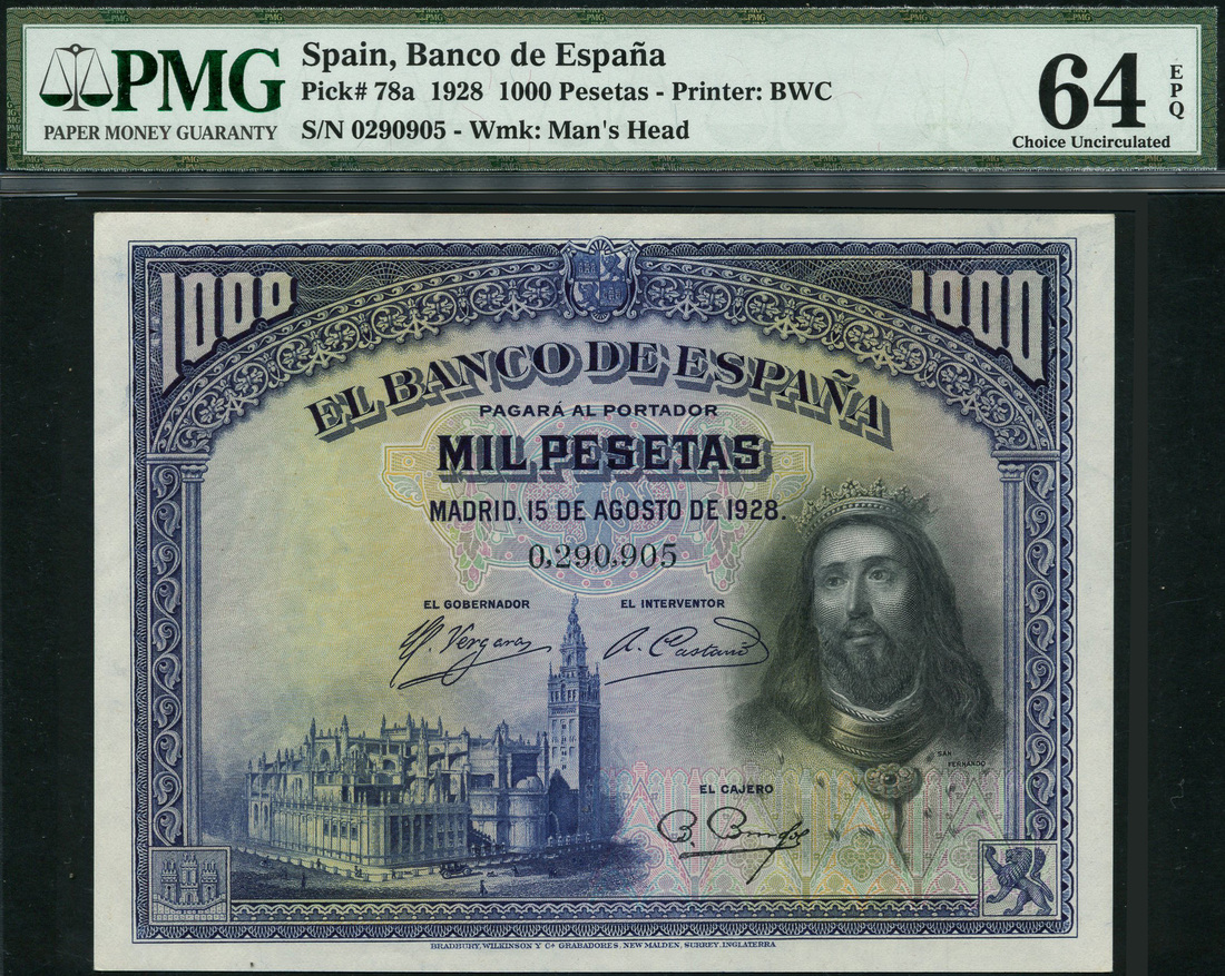El Banco de Espana, 1000 pesetas, 15 August 1928, serial number 0,290,905, dark blue on light green and lilac underprint, portrait San Fernando at right, Cathedral of Seville at low left, value top left and right and at top centre, ornate border, reverse, painting of King receiving communion