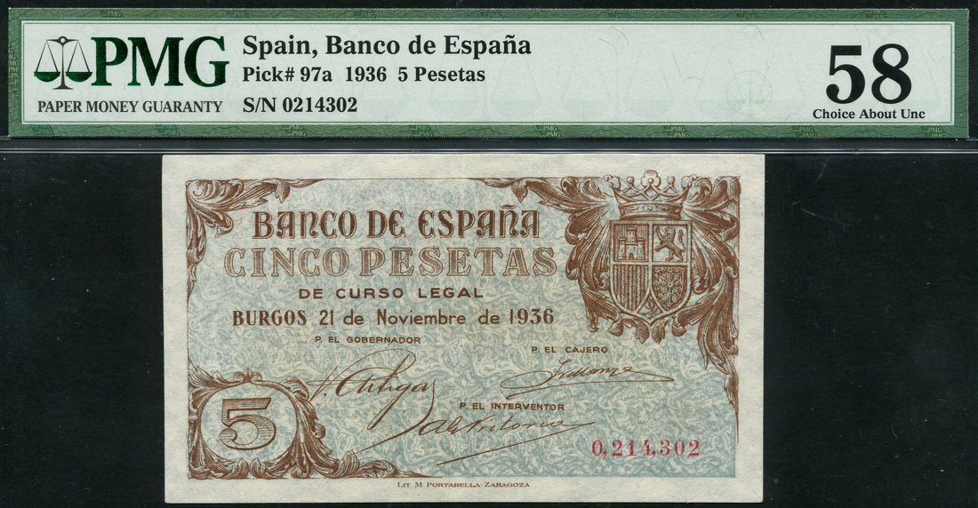El Banco de Espana, 5 pesetas, 21 November 1936, serial number 0,214,302, brown on light blue, arms top right, value low left and top centre left, reverse, value in three corners and in ornate tablet at centre