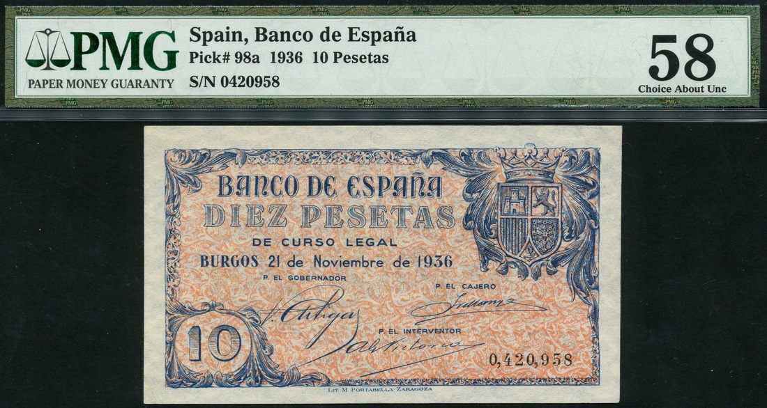 El Banco de Espana, 10 pesetas, 21 November 1936, serial number 0,420,958, blue and pink, coat of arms top right, value top centre left and at low left, ornate border, reverse, bank title top centre, value top and low left, low right and in elaborate panel at centre