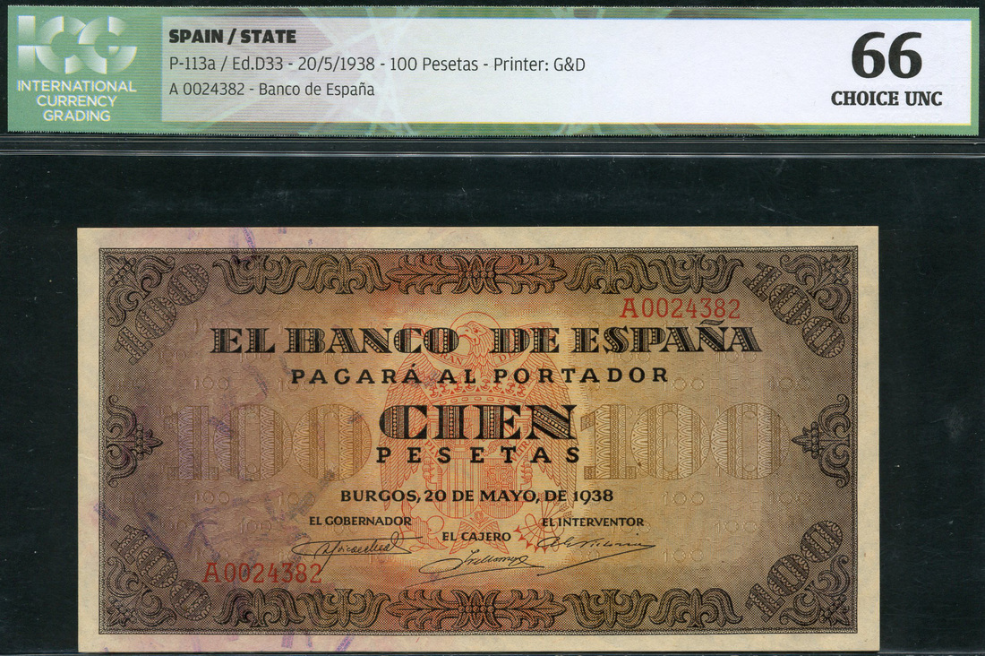 El Banco de Espana, 100 pesetas, 20 May 1938, serial number A0024382, brown on pale lilac and orange, bank title top centre, arms at centre flanked by value, ornate border, reverse, House of Cordon in Burgos, value within columns at left and right