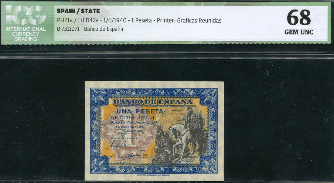 El Banco de Espana, 1 peseta, 1 June 1940, serial number B7311071, blue and orange, Hernan Cortez on horseback at right, value in light brown tablet at left, reverse, arms at centre flanked by value, also, 1 peseta, 4 September 1940, serial number H5880841, brown on light yellow and blue, Santa Maria in full sail at centre, bank title top centre, reverse, bank title and value within guilloche pattern