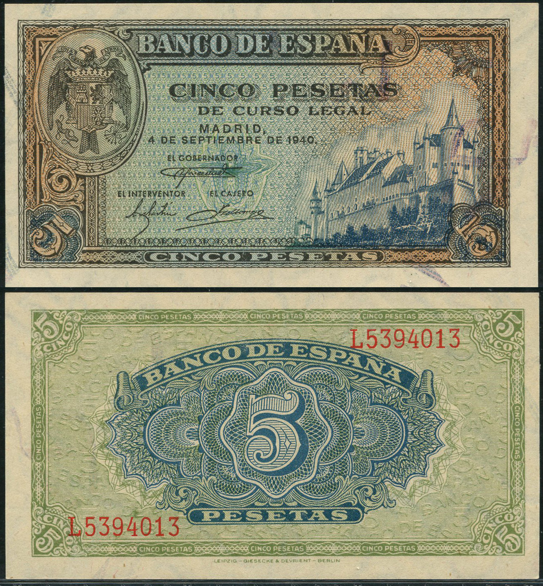 (x) El Banco de Espana, 5 pesetas, 1940, prefix L, brown and blue-green, arms at left