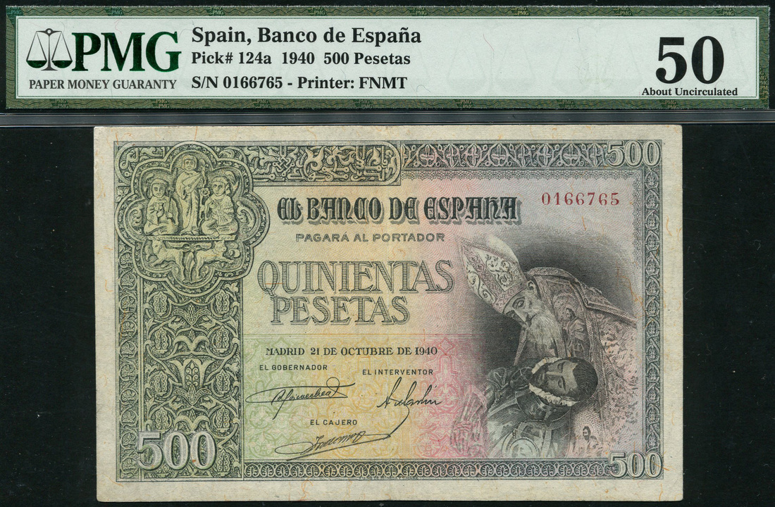 El Banco de Espana, 500 pesetas, 21 October 1940, serial number 0166765, black on light green, yellow and pink underprint, Conte de Orgaz by El Greco at right, ornate column at left, reverse, view of Toledo, arms at right