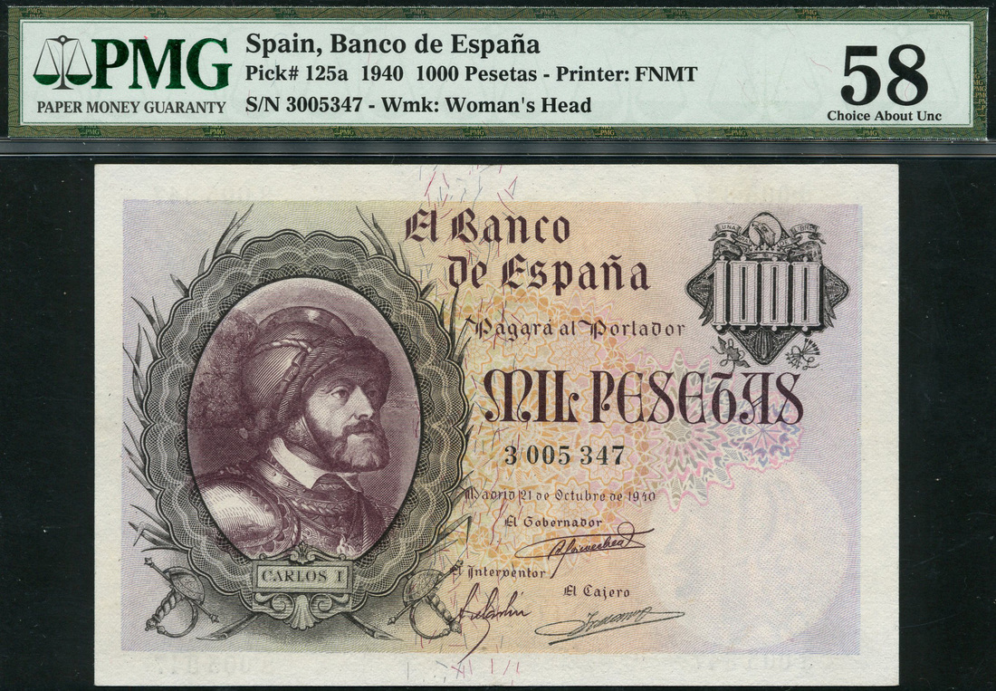 El Banco de Espana, 1000 pesetas, 21 October 1940, serial number 3 005 347, purple on pale orange and violet underprint, portrait King Carols in ornate oval frame at left, value top and centre right, reverse, coat of arms flanked by value in guilloche patterns