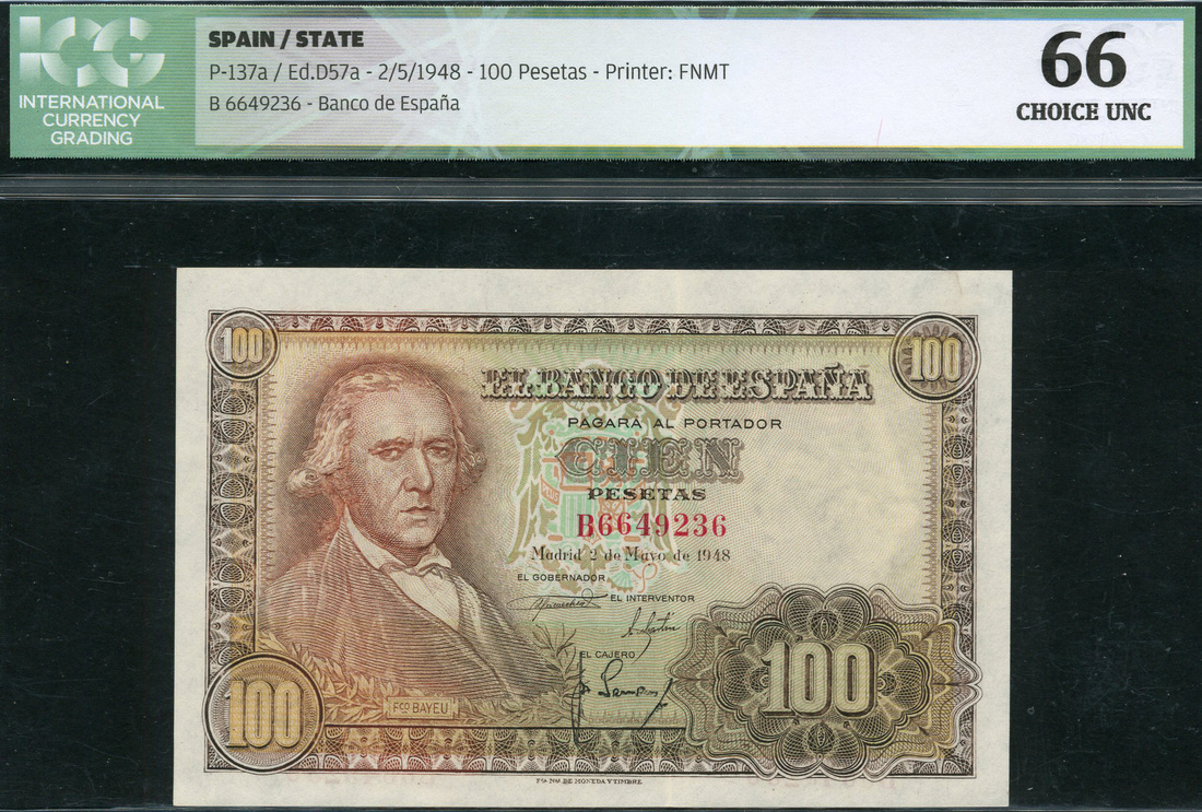 El Banco de Espana, 100 pesetas, 2 may 1948, serial number B6649236, brown and orange on multicolour, Francisco Bayeu at left, value in each corner, reverse brown