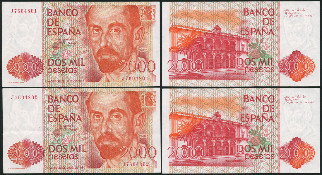 (x) El Banco de Espana, 2000 pesetas, 1980, serial number J 7604801/812, red, Jiminez at right