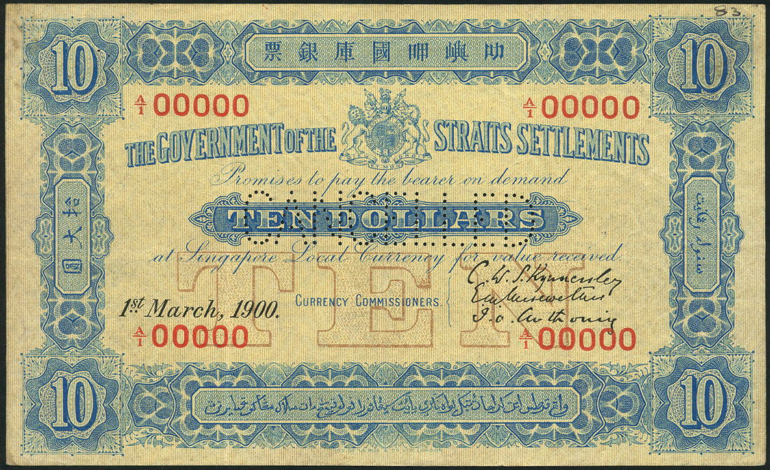 (†) Government of the Straits Settlements, specimen $10, 1 March 1900, serial number A/100000,