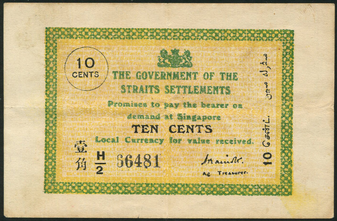 Government of the Straits Settlements, 10 cents, 1 February 1918, serial number H/ 66481, black on green and yellow, arms at top centre, reverse red, crown at centre