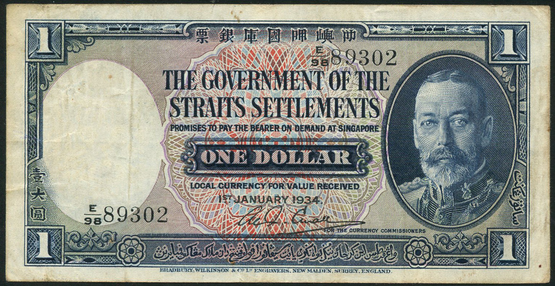 Government of the Straits Settlements, $1, 1 January 1934, serial number E/98 89302, dark blue on multicolour underprint, George V at right, value at centre and each corner, reverse blue, tiger at centre