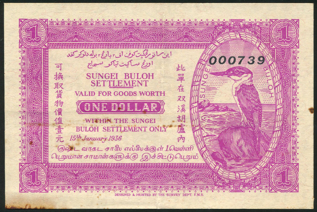 Sungei Buloh Leprosarium Settlement currency, $1, 15 January 1936, serial number 000739, lilac and white, white-breasted kingfisher at centre, value at centre and at each corner and in Malay, Tamil and Chinese script in field, reverse lilac and white, value at left and right of red central guilloche
