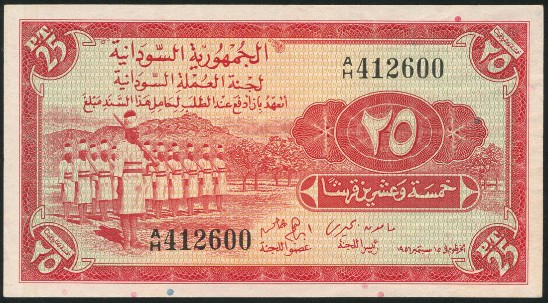 Sudan Currency Board, 25 piastres, 1956, prefix A/H, red and pale green, soldiers at left, Ishag and Beheiry signatures, also 25 piastres, 1971, red