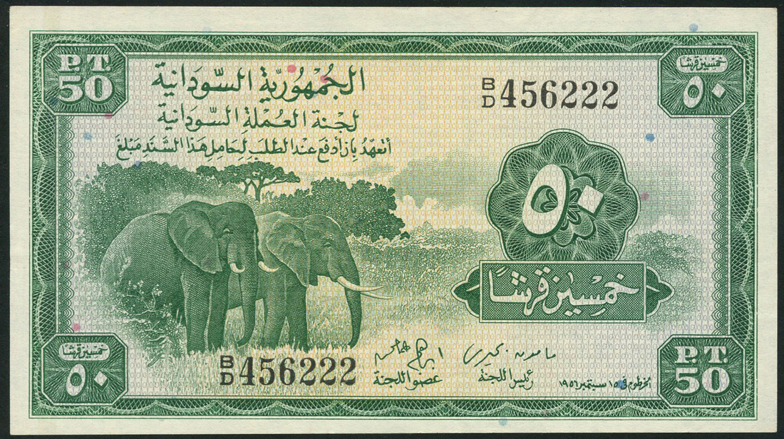 Sudan Currency Board, 50 piastres, 1956, prefix B/D, green, elephants at left, Ishag and Beheiry signatures