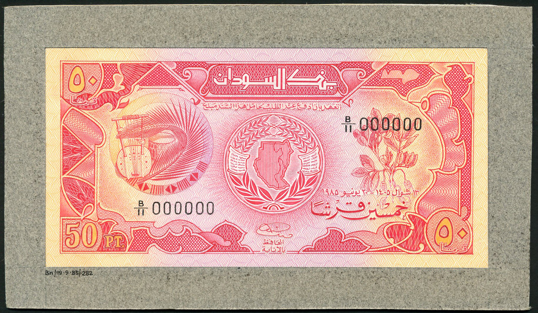 (†) Bank of Sudan, a printers archival composite essay on board for the 50 piastres of 1985, serial number B/11 000000, red and pale orange and lilac, arms at centre, lyre and drum at left, peanut plant at right, reverse red, Bank of Sudan at centre