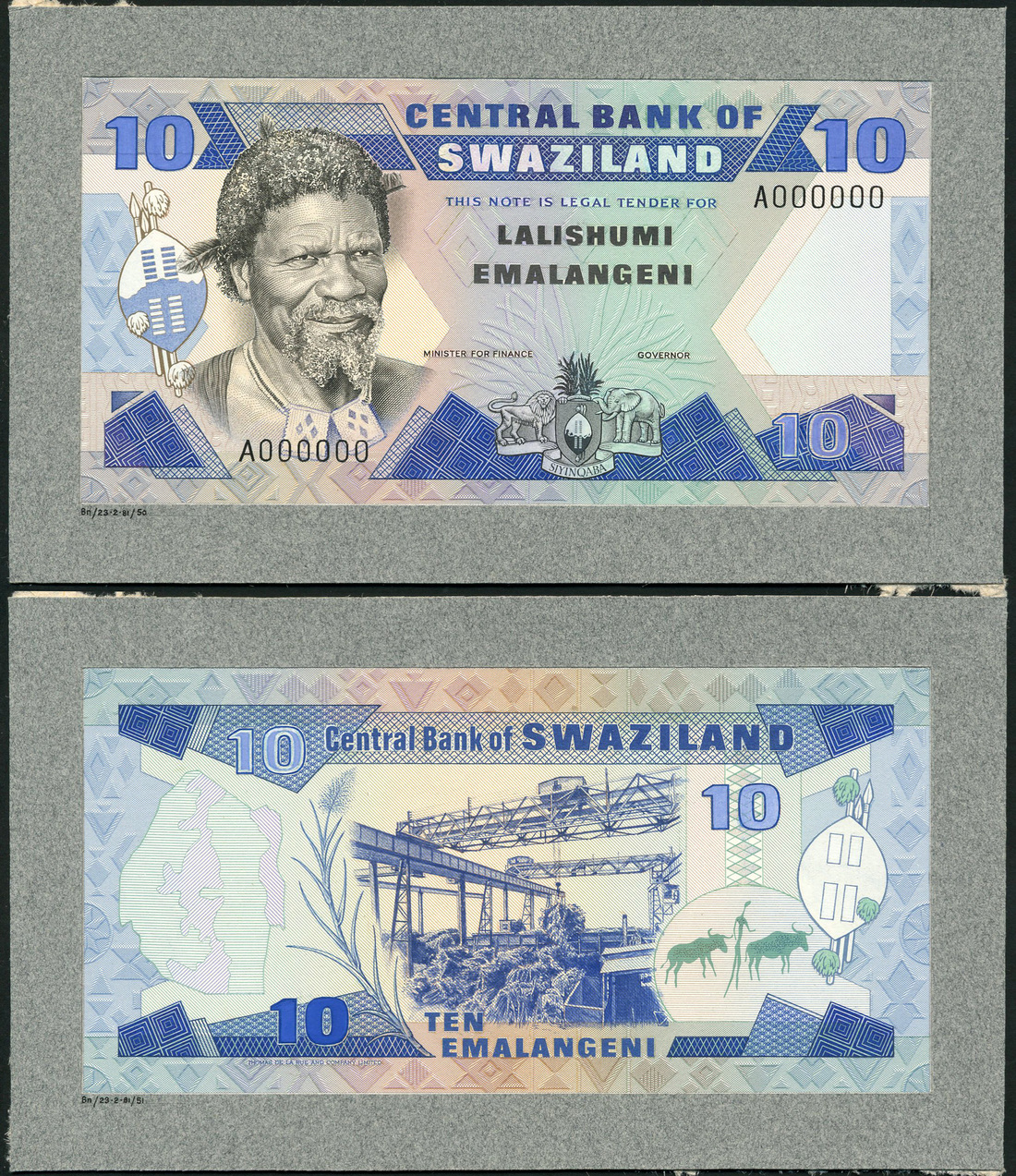 (†) Central Bank of Swaziland, a composite essay for a proposed issue of 10 emalangeni, ND (ca 1981), serial number A 000000, blue and pink, King Sobhuza II at left, arms low centre, reverse blue and multicoloured, mining scene