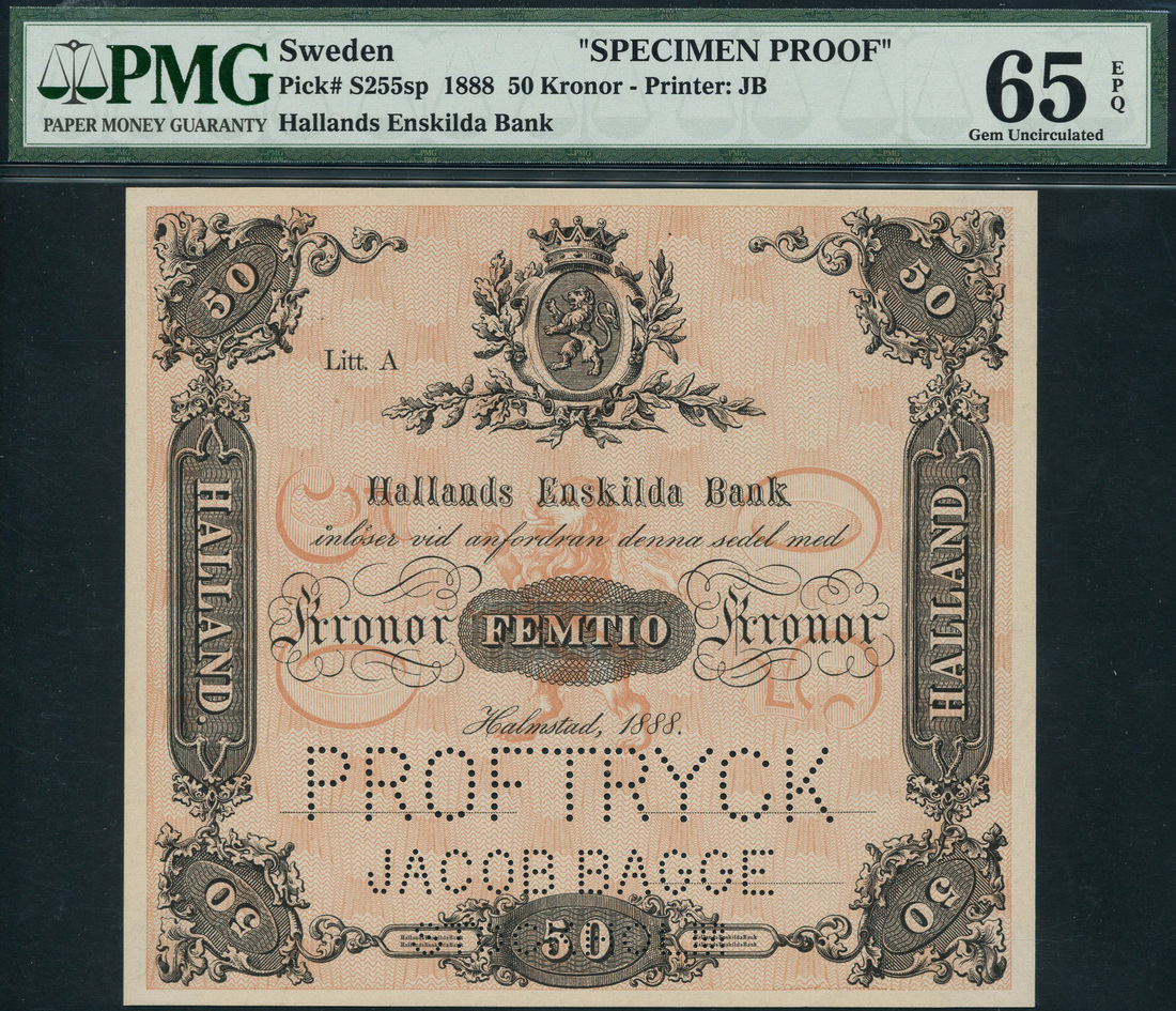 (Pick S255s), perforated PROFTRYCK JACOB BAGGE STOCKHOLM below, in PMG holder 65 GEM UNCIRCULATED, EPQ