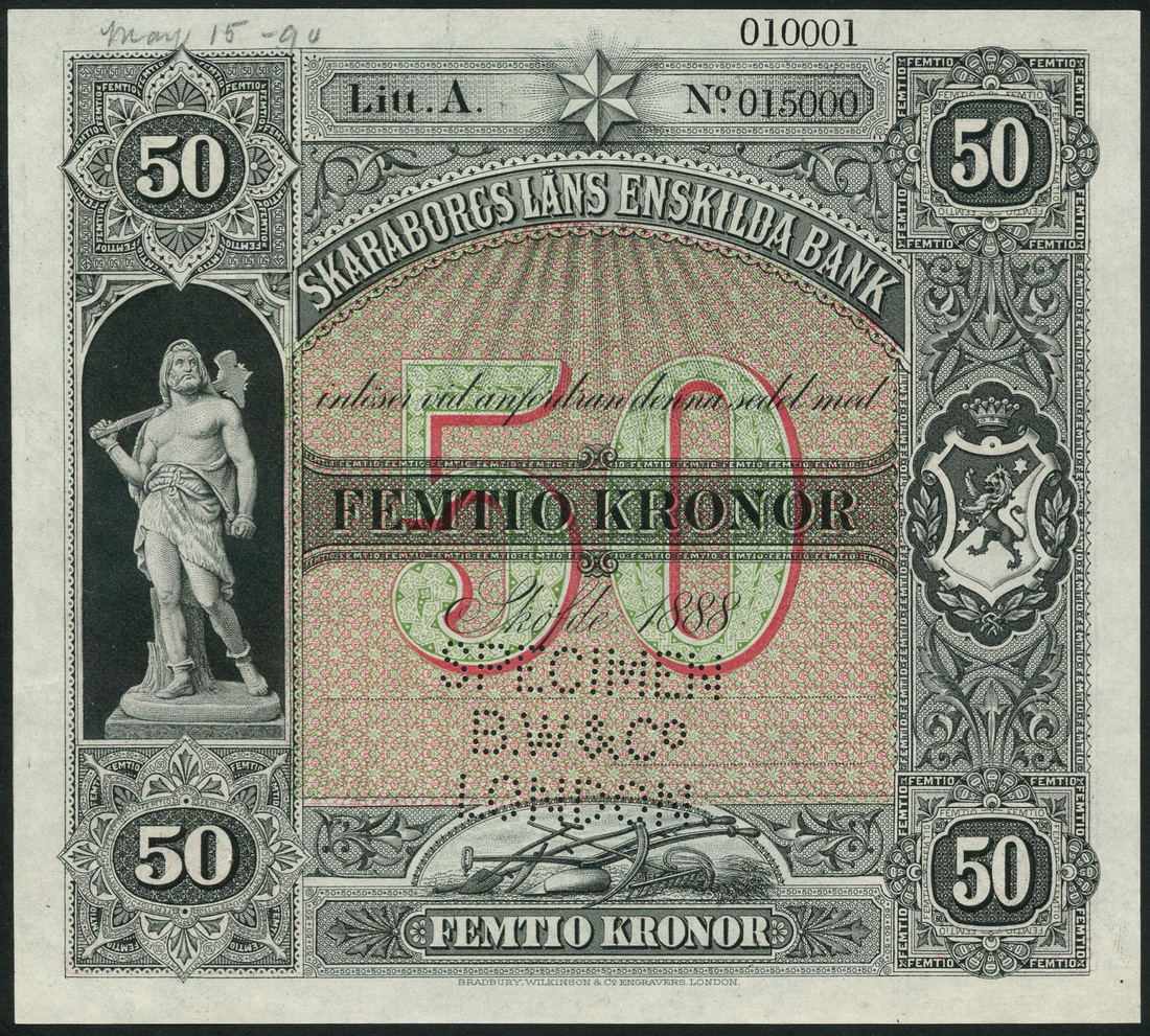 (†) Skaraborgs Lans Enskilda Bank, specimen 50 kronor, Skofde, 1888, serial number A 010001-015000, black, pink and green, statue at left, arms at right, agricultural implements low centre, reverse pink and green, arms