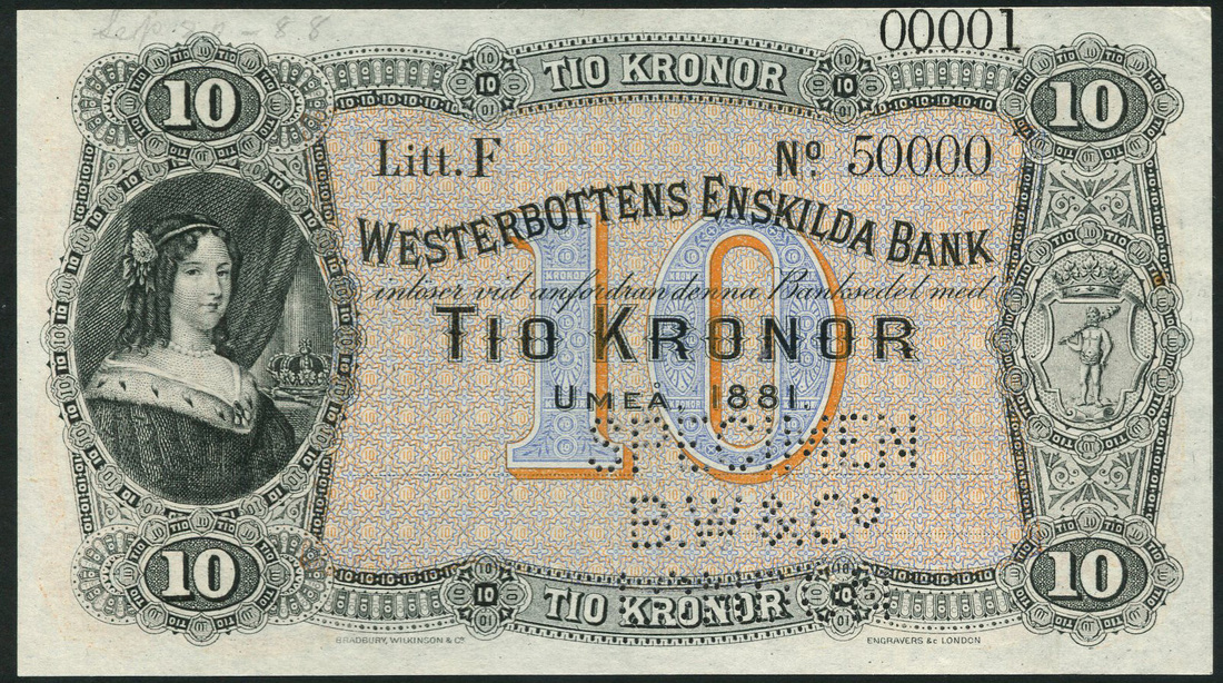 (†) Westerbottens Enskilda Bank, 10 kronor, Umea 1881, serial number F 00001-500000, black on orange and blue, Queen Christina at left, coat of arms at right, reverse blue and orange