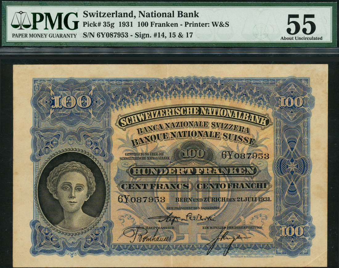 (x) Schweizerische National Bank, 100 franken, 21 July 1931, serial number 6Y087953, blue and light orange, portrait of woman in circular frame at left, value in three corners and at centre, ornate border, reverse, man with scythe at centre, elaborate border around