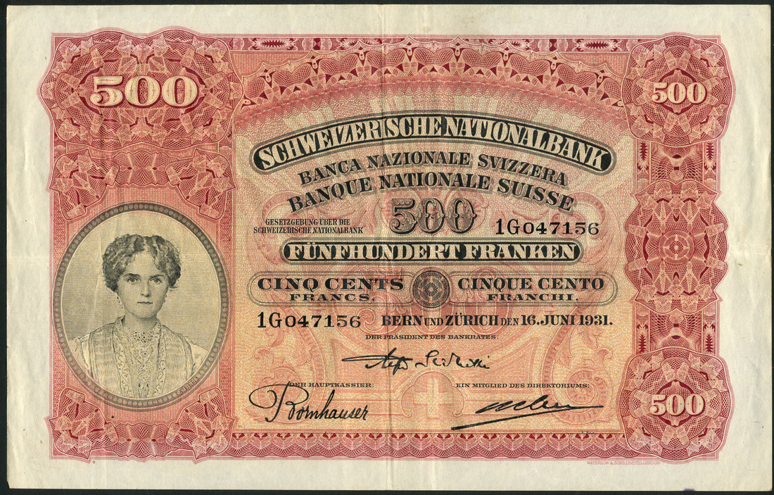 Schweizerische National Bank, 500 francs, 16 June 1931, serial number 1G 047156, red and pale orange, girl in national dress at left, three printed signatures below, Sarasin, Bornhauser and Weber signatures, reverse brown, women sewing