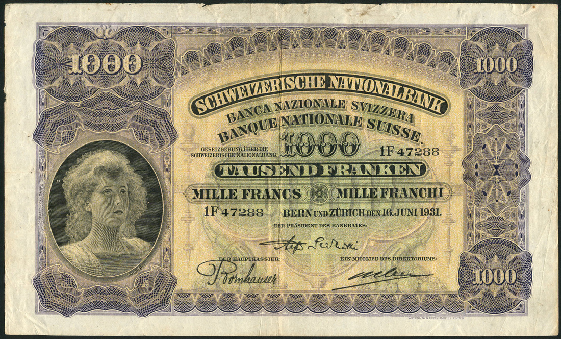 Schweizerische National Bank, 1000 francs, 16 June 1931, serial number 1F 47288, violet, pale pink and pale orange, girl in national dress at lef, three printed signatures below, Sarasin, Bornhauser and Weber signatures, reverse violet, foundry workers