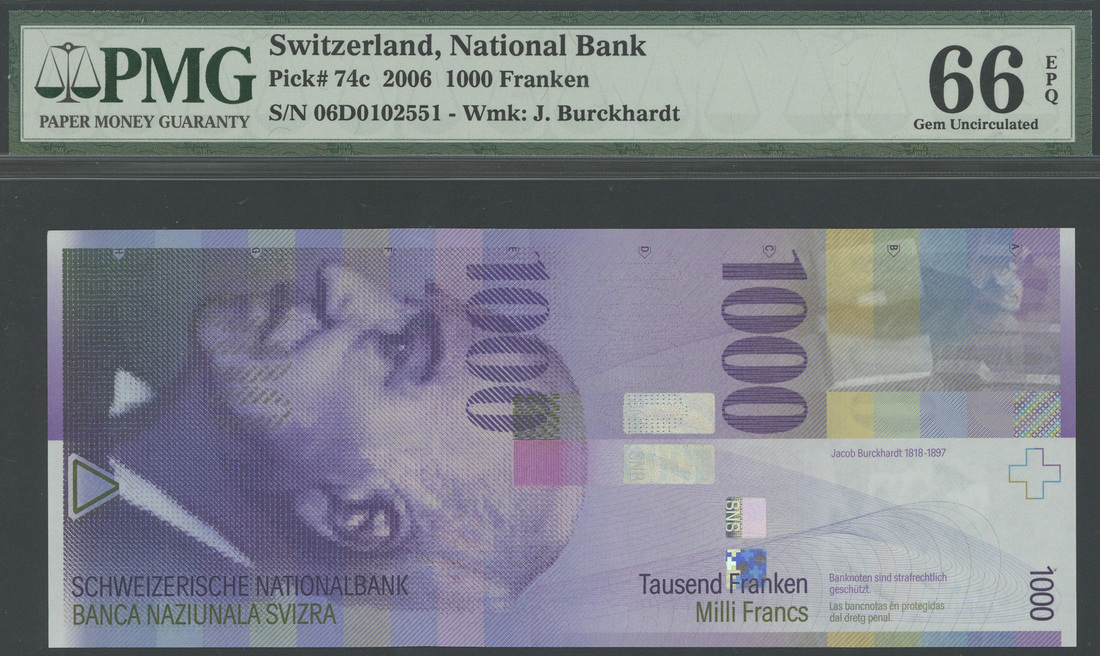(x) Schweizerische National Bank, 1000 franken, 2006, serial number 06D0102551, purple and multicolour, Jacob Burckhardt at left, reverse multicolour, window and the Pergamon Altar at left