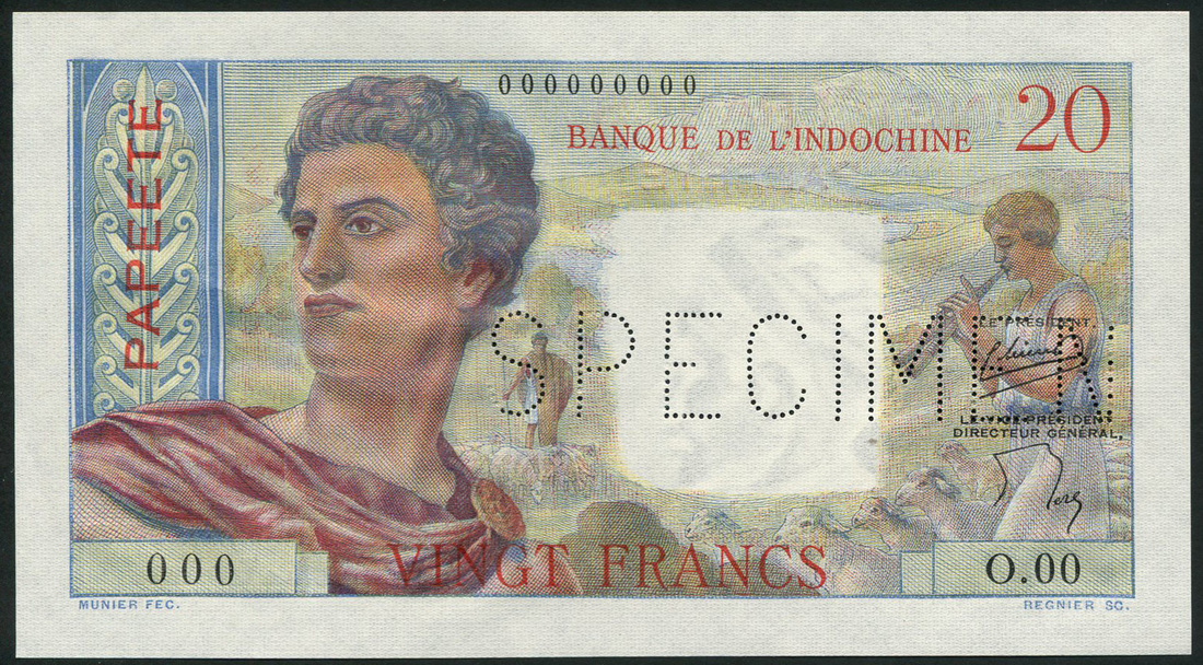 Banque de l'Indo-Chine, Tahiti, specimen 20 francs, ND (1963), also a 20 francs, ND (1954) for New Caledonia, both purple and blue, pan pipes at right, classical male figure at left