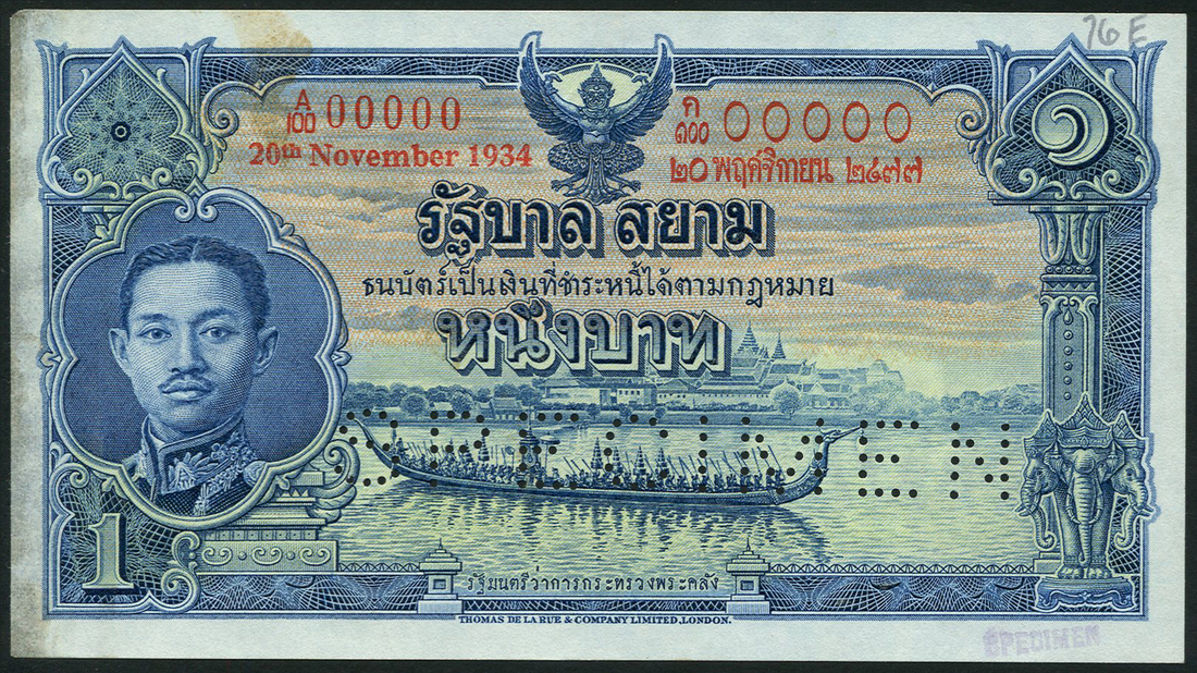 (†) Government of Siam, specimen 1 baht, 20 November 1934, serial number A/100 00000, blue on multicolour underprint, Rama VII at left, Garuda at top centre, Royal Barge at low centre, reverse blue, island temple, perforated SPECIMEN and small purple SPECIMEN handstamp at low right