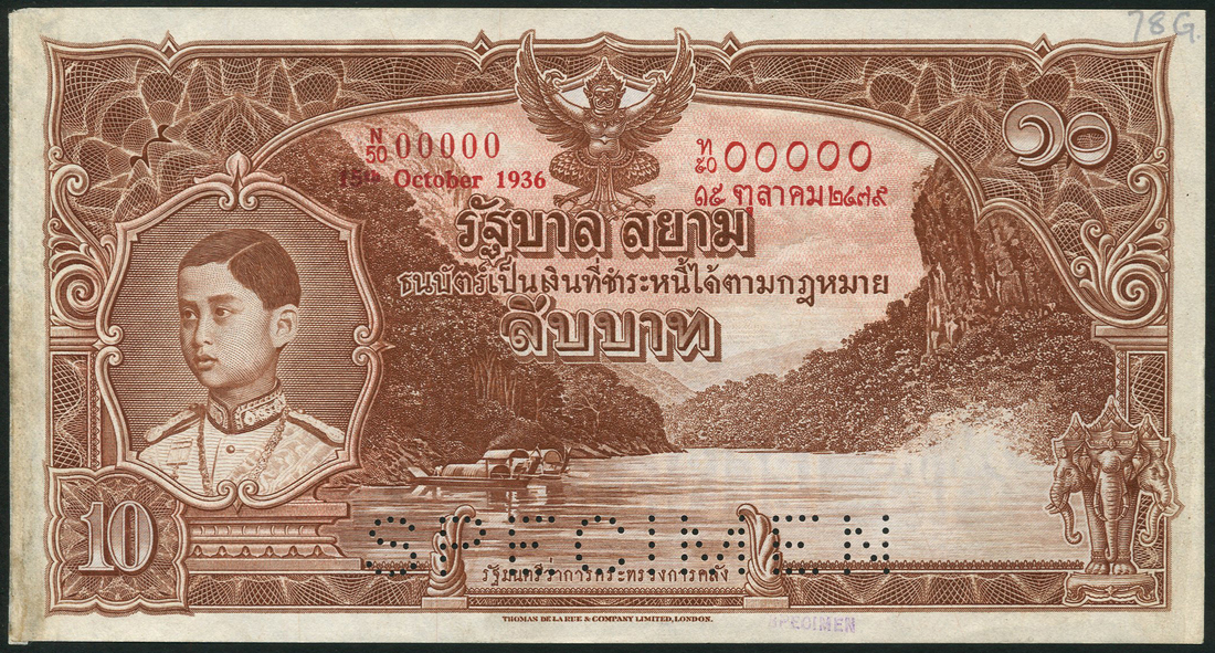 (†) Government of Siam, specimen 10 baht, 15 October 1936, serial number N/50 00000, brown, King Rama VIII as a child at left, Garuda at top centre, boats on a river in a steep sided gorge at centre, reverse, island temple, perforated SPECIMEN