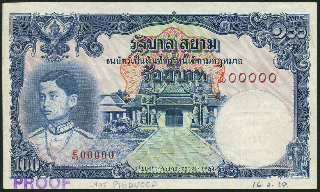 (†) Government of Siam, specimen 100 baht, ND (1939), serial number E/40 00000, dark blue on multicolour underprint, King Rama VIII as a child at left, Garuda at top left, temple doorway at centre, reverse, Royal Throne Hall at centre, purple PROOF stamp